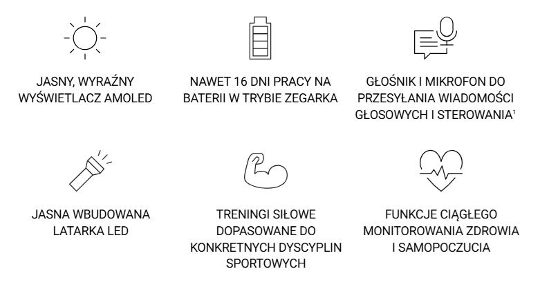 - Ten multisportowy smartwatch GPS klasy premium został stworzony z myślą o wynikach. Korzystaj z szerokiej gamy funkcji - treningu siłowego, nurkowania, wbudowanego głośnika i mikrofonu do obsługi głosowej, zintegrowanej latarki LED i nie tylko.